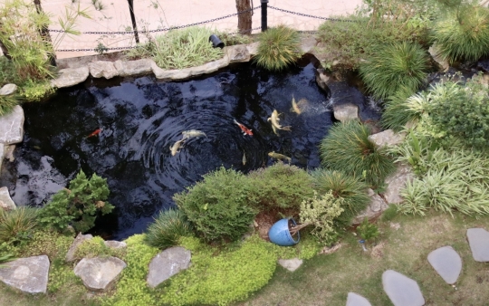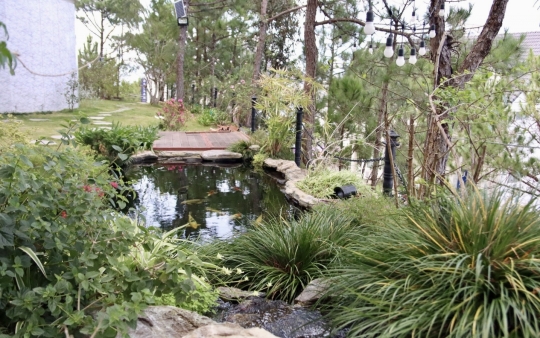 Không gian sân vườn – hồ cá tạo nên khung cảnh sang trọng nhưng trẻ trung mà ít villa nào ở Đà Lạt làm được.